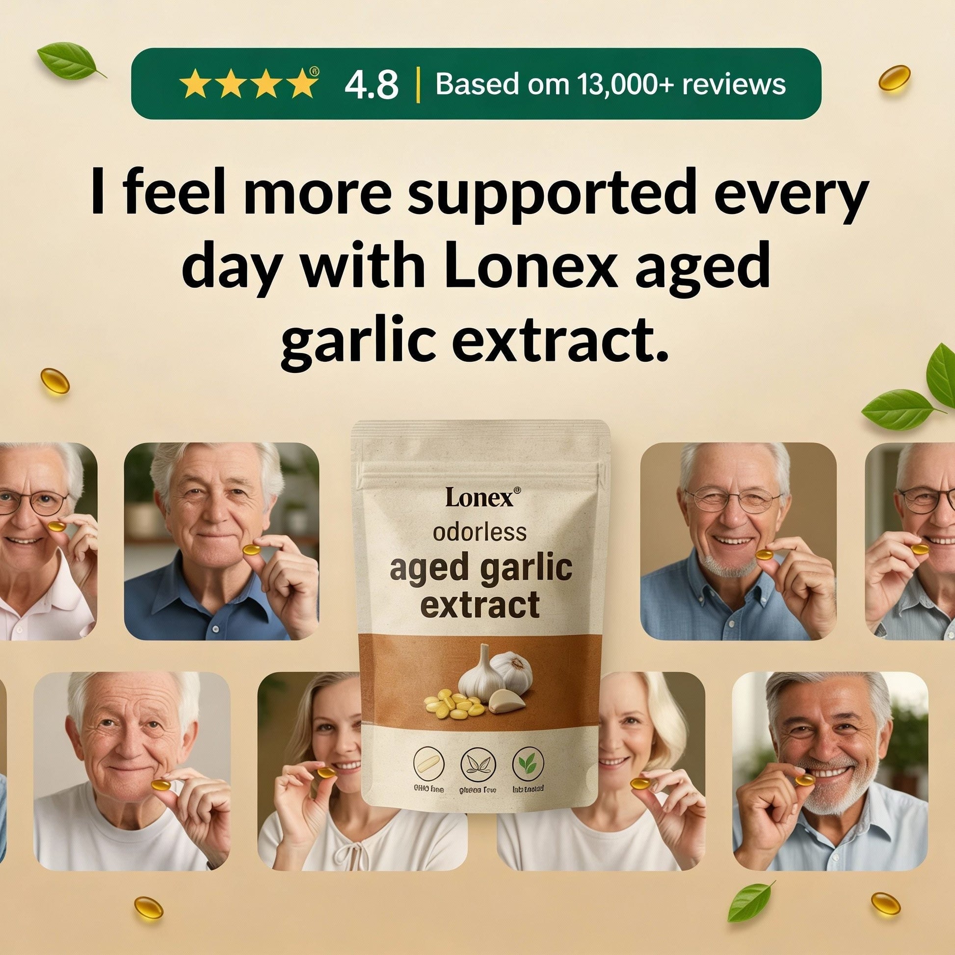 Lonex utilise un extrait d’ail vieilli lentement, sans odeur, conçu pour un soutien cardiovasculaire, immunitaire et antioxydant au quotidien. Appuyé par des décennies de recherche scientifique.